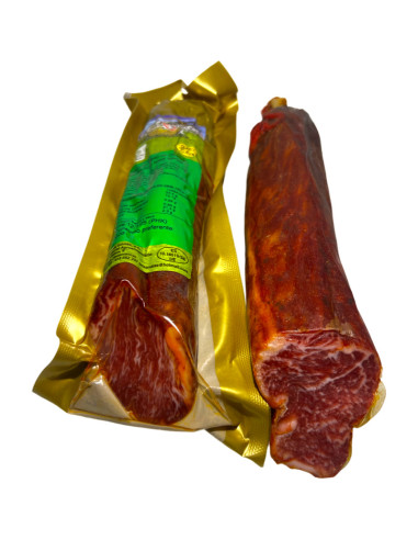 El lomo ibérico se caracteriza por su color rojizo intenso con veteado de grasa, una textura jugosa y un sabor intenso y característico que varía según el tipo de cerdo y de su alimentación. Es un producto noble, magro y saludable rico en proteínas, vitaminas y ácido oleico, se elabora a partir del musculo lumbar del cerdo, macerado con especias (ajo, pimentón y sal) y curado lentamente.
