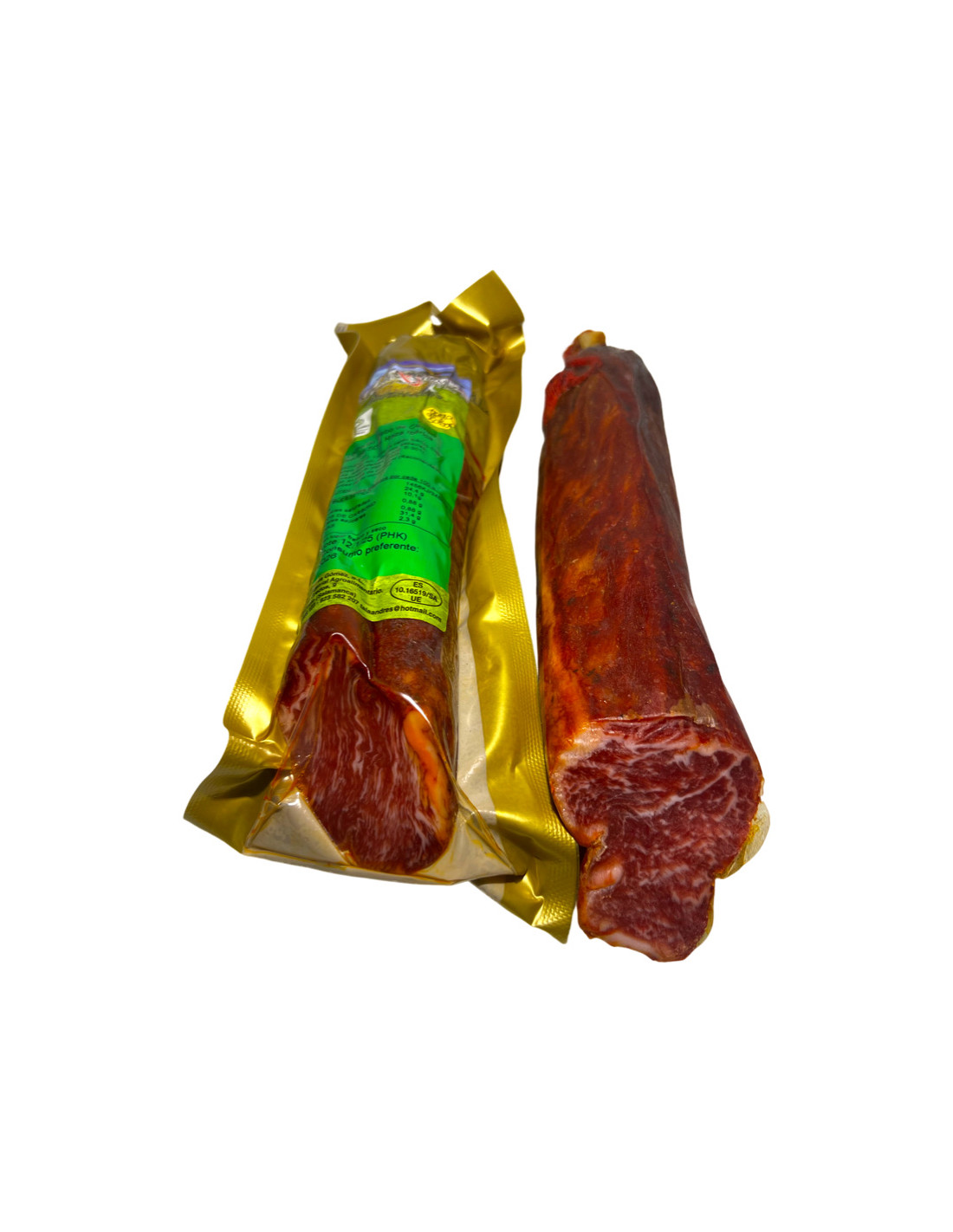 Lomo de cerdo ibérico cebo de campo, sal, ajo, pimentón, especias, dextrosa, antioxidantes (E-300, E-301), conservantes (E-252, E-250). Embutido en tripa de colágeno (recomendable retirar antes del consumo).